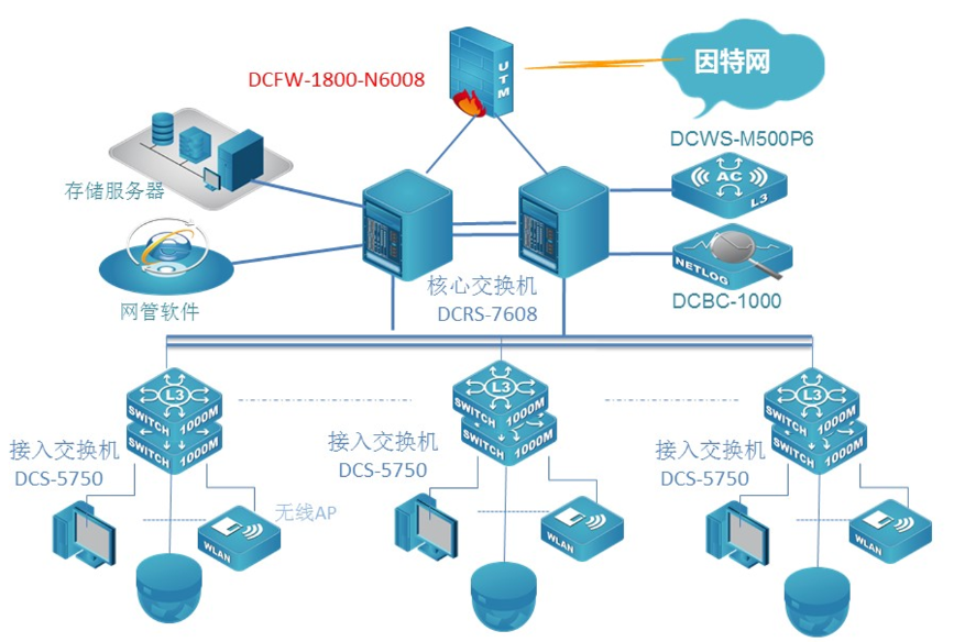 中国江苏白马农业会展中心数据网核心采用两台PA真人国际新一代全分布式架构的核心路由交换机DCRS-7608E,顺利获得VSF功能实现核心冗余和负载分摊;该设备具备强大的业务自适应能力,支持网络平滑升级和策略灵活调度,实现业务快速部署,从而构建业务定义的网络。网络出口采用具有高度集成化的多核安全防火墙,给予包括路由器,防火墙,VPN网关,等功能在内的一体化设备,该设备8Gbps的吞吐量完全满足了园区网对出口的要求。接入交换机采用PA真人国际全千兆24口接入交换机DCRS-5750E,实现客户端千兆接入,万兆上联核心。POE交换机全部采用三层交换机DCRS-5750-28P-P全千兆POE交换机。采用8200双频无线AP使用办公区无线覆盖。展厅和会议室采用高密度AP8200-I3实现展厅高密度覆盖,室外采用8200室外AP实现无线覆盖,无线网络顺利获得一台DCWS6000-M500P6控制器集中管理无线网络。出口部署一台DCBC上网行为审计设备,实现上网行为安全审计。